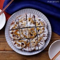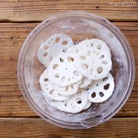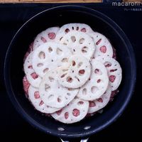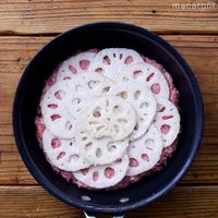 肉だねの上にれんこんを全体に敷き詰め、フライ返しでしっかり押さえます。