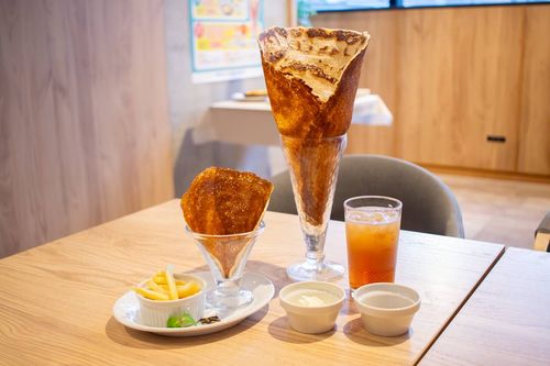 「クリスピークレープ」が運ばれてきて、まず驚くのが“大きさ”。人の顔よりも大きなサイズには、思わず笑ってしまうほどのインパクトがあります。