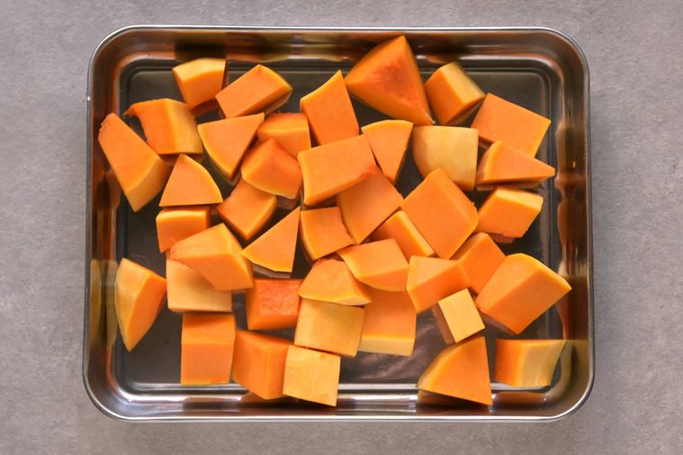 バターナッツかぼちゃは、ピーラーで皮を剥いて種とワタを取り除き、3cm角に切ります。