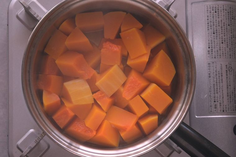 鍋にかぼちゃと水を入れて火にかけます。
