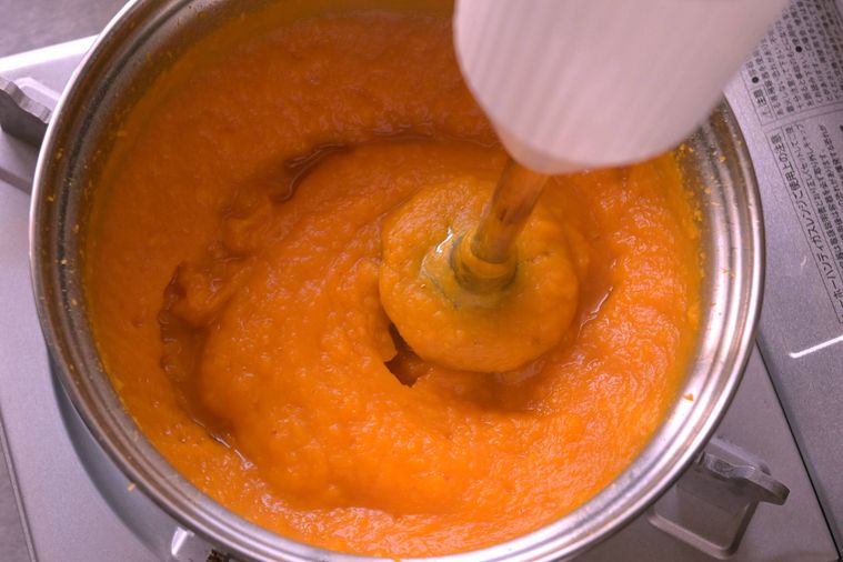 かぼちゃがやわらかく煮えたら火を止め、ハンドブレンダーでなめらかな状態になるまで攪拌します。ミキサーやフードプロセッサーを使ってもOKです。