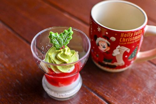 サンタ帽をかぶったミッキーマウスとクリスマスを感じられるデザインがかわいいスーベニアカップつき。
