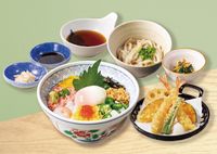 すし、天ぷら、茶わんむし、北海道そばを一度に楽しめる豪華なセットです。そばは冷たいざるそば、温かいかけそばのほか、うどんにも変更でき、その日の気分や季節に合わせて選べます。とんでんの人気メニューを少しずつ贅沢に味わいたいときにぴったりですよ♪