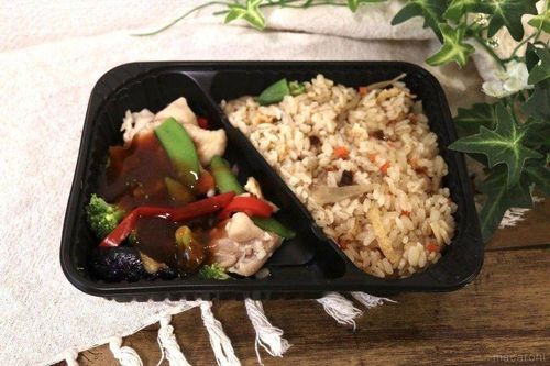 豚ひき肉入りの甘辛味噌ソースで仕上げたなす味噌炒めと、やさしい味わいの炊き込みご飯を合わせたお弁当。ごろりと大きななすは食べ応えがあり、濃厚な肉味噌がよく絡みます。炊き込みご飯は控えめの味付けなので、具材の濃厚さをより引き立ててくれますよ。