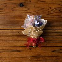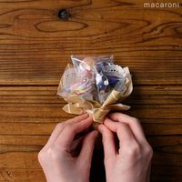 持ち手の部分をテープで留め、リボンを結びます。形を整えたら完成です。
