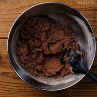 米粉、アーモンドプードル、ココアパウダーをふるい入れ、ゴムベラでさっくり切り混ぜます。