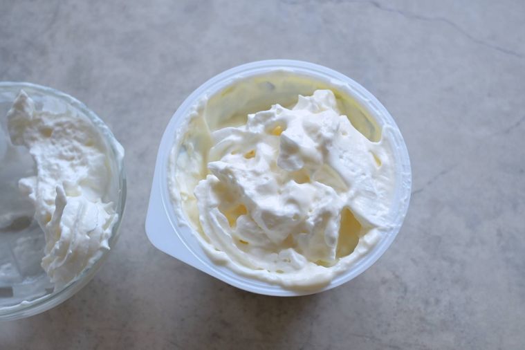 オイコスを軽くほぐし、ホイップクリームを2~3回に分けて加えて混ぜ合わせます。