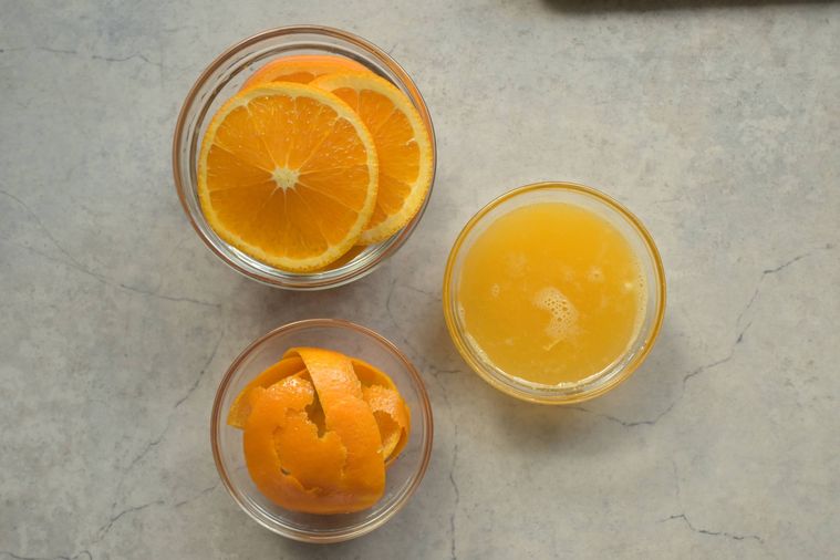 オレンジは一個を飾り用に輪切りにし、もう一個は皮を剥き、果汁を絞ります。皮は、苦みのある白いワタの部分をそぎ落とし、オレンジ色の部分だけ使います。