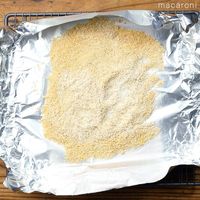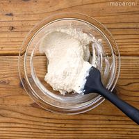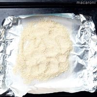 クッキングシートを敷いた天板に、粉末状にしたオートミールとアーモンドプードルをのせ、軽く混ぜて平にならします。