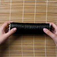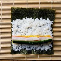 巻き簾に海苔を置き、奥側を2~3cm残して酢飯を半量広げます。