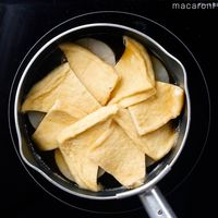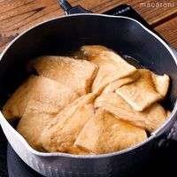 ・油揚げに熱湯をかけて油抜きをし、1枚を4つの三角形に切ります。