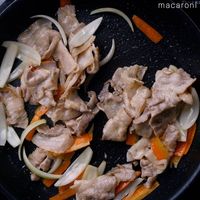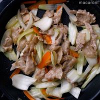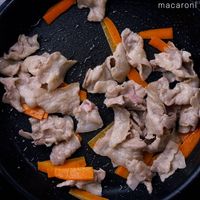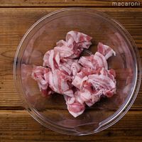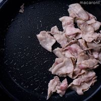 フライパンに半量のサラダ油(大さじ1/2杯)を入れて熱し、豚肉を加えて軽く火を通します。
