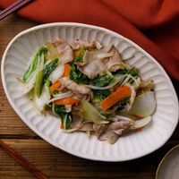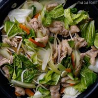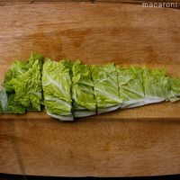 白菜は芯と葉にわけ、葉は3cm幅のざく切りに、芯は葉の大きさより小さめに削ぎ切りにします。