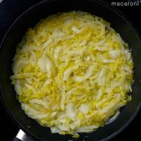 白菜を加えて玉ねぎが薄く色づくまで炒めます。水を加えてフタをし、白菜がやわらかくなるまで弱中火で5分煮ます。