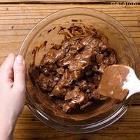 マシュマロ、ビスケット、クルミを加え、全体にチョコレートが絡むように混ぜます。