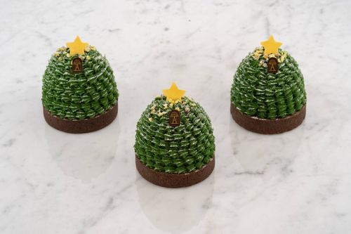 ショコラタルトの上に、マロングラッセ入りのマロンケーキを重ね、濃厚なマロンクリームでツリーの形を表現。なかにはたっぷりのクリームと、ピスタチオの風味豊かなムースが隠れています。