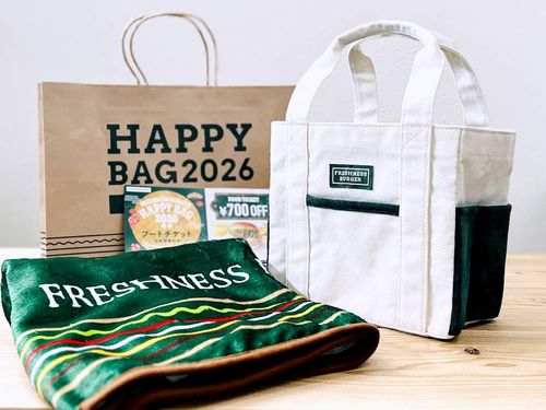 フレッシュネスバーガーの「HAPPY BAG 2026」は、オリジナルのトートバッグとブランケットが入った福袋。さらに3,500円分のフードチケットもセットになっています。