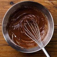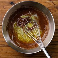 米粉、ココアパウダー、ベーキングパウダーをふるい入れ、粉気がなくなるまで混ぜます。