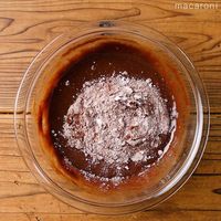 ホットケーキミックス、ココアパウダーを入れ、ゴムベラでさっくりと切るように混ぜ合わせます。