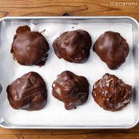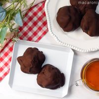 ④を1つずつチョコレートの中にくぐらせたら、クッキングシートに並べてチョコレートが固まるまで15分ほど冷凍します。