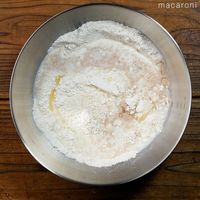 ボウルに薄力粉、強力粉、砂糖、塩、ドライイーストを入れ、ドライイーストめがけて温めた牛乳、サラダ油を流し入れます。