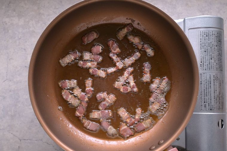 ほうとう麺をゆでている間にベーコンを焼きます。ベーコンは1cm幅に切り、オリーブオイルをひいたフライパンでカリカリになるまで焼きます。