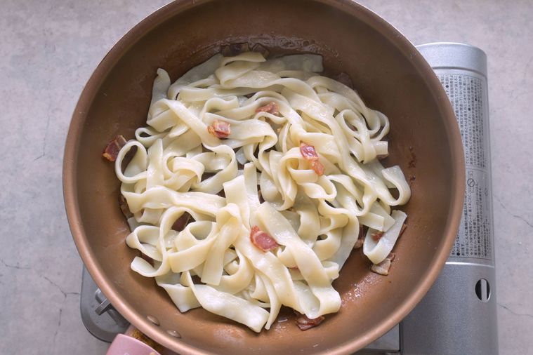ベーコンを焼いたフライパンに、麺のゆで汁お玉1杯分(約40~50cc:分量外)を加えて煮立たせます。麺を加えてあえながらベーコンの旨味を麺に吸わせます。