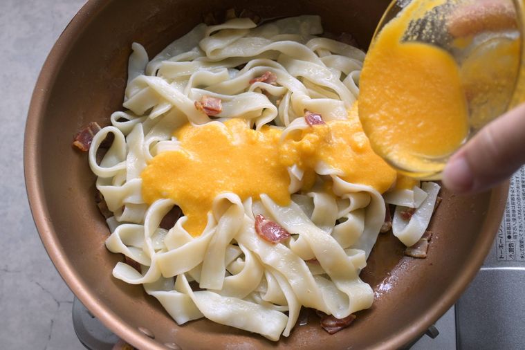 幅広で厚みのあるほうとう麺は熱を持ちやすいため、火をつけたまま卵液を入れるとすぐにダマになります。必ず火を止めてから、余熱でゆっくりとソースを乳化させるのが失敗しないコツです。
