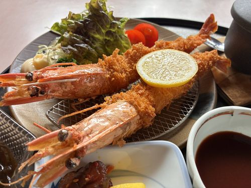 定食のおすすめを尋ねると、森田さんが真っ先に挙げたのが「エビフライ定食」だ。特大の有頭海老が2匹も付くこの定食は、見た瞬間に強いインパクトを与える。さくっとした衣の中に、プリプリとした食感のエビフライが収まり、さらに茶碗蒸しと小鉢まで付く充実した内容となっている。