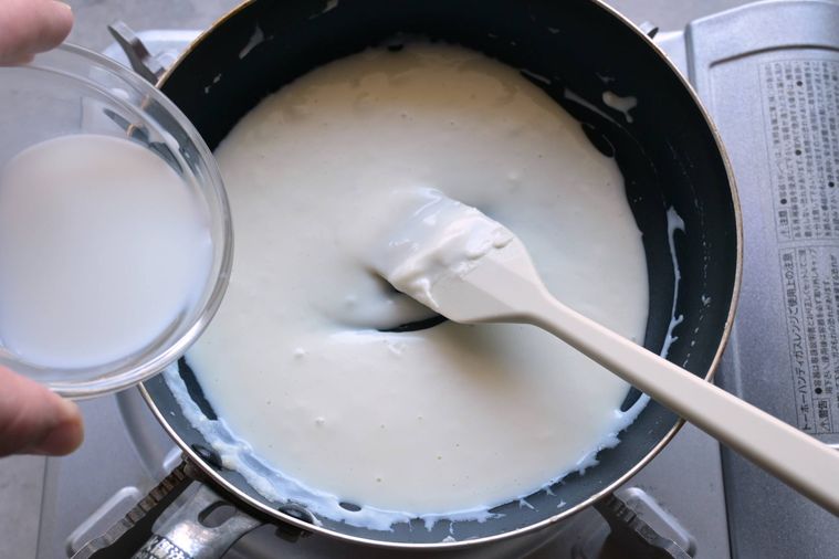 残りの牛乳を2回に分けて加え、ヘラでかき混ぜながら弱火で温めます。
