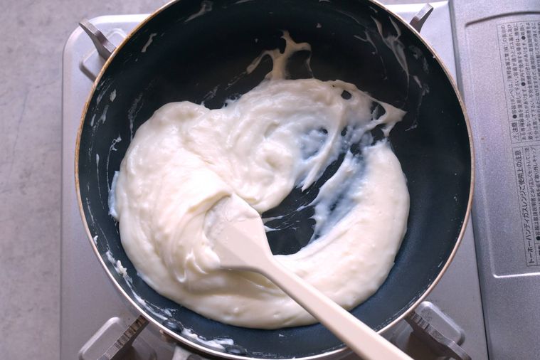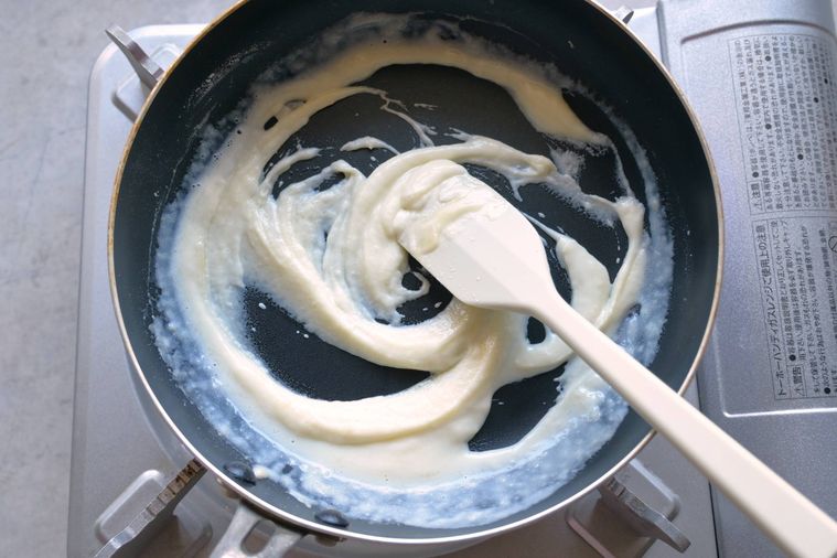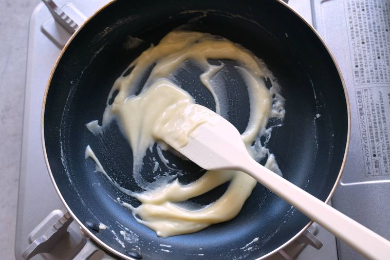 もったりした状態になり、ヘラですくったあとが消えずにフライパンの底が見えたままになればOK。
