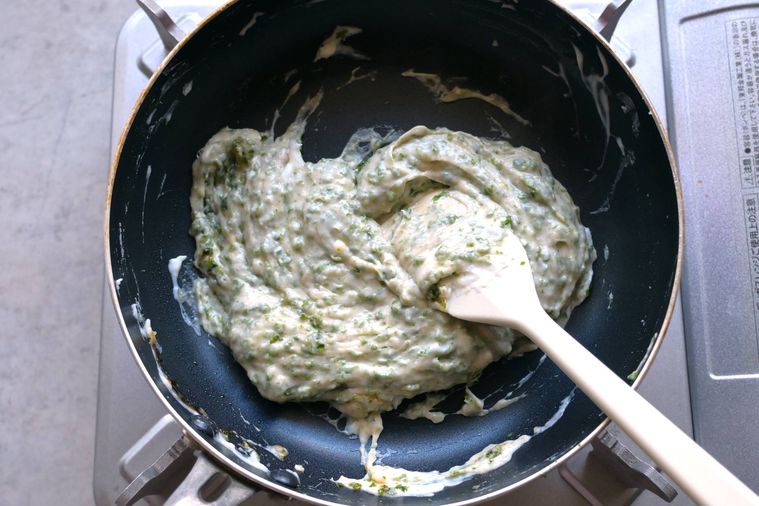 オイスターソースと青のりを加えてよく混ぜ合わせれば特製クリーミーソースのできあがり。常温まで冷ませば固まってくるため、扱いやすくなりますよ。