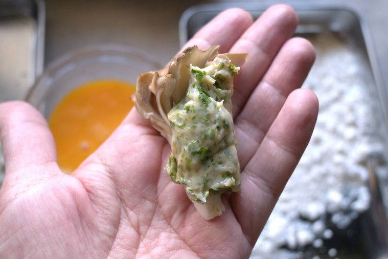 4.まいたけに特製ソースをのせて衣を付ける