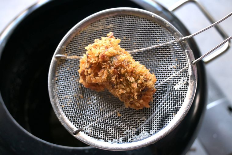 170℃に熱した揚げ油できつね色に揚げれば完成です。