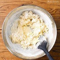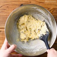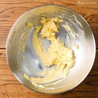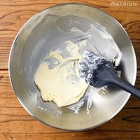 クッキー生地を作ります。ボウルにバターを入れ、なめらかになるまでゴムべらで混ぜます。
