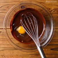 薄力粉、ココアパウダー、ベーキングパウダーをふるい入れ、混ぜ合わせます。