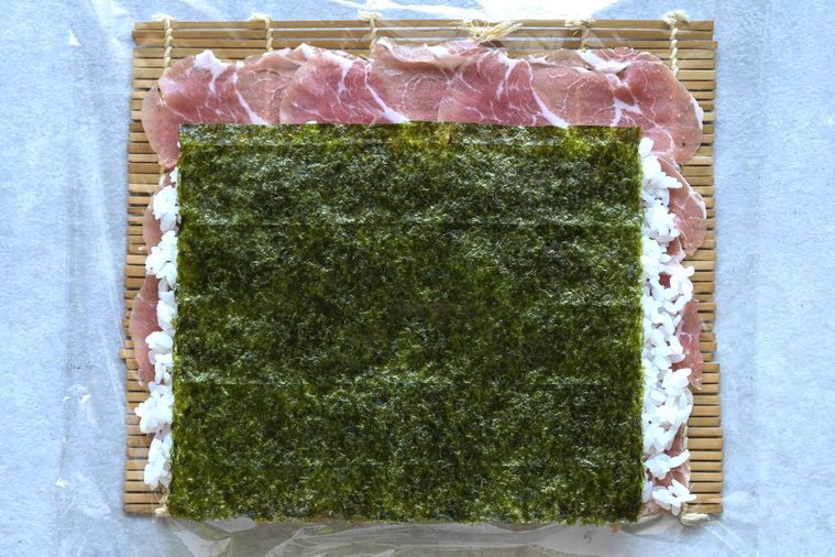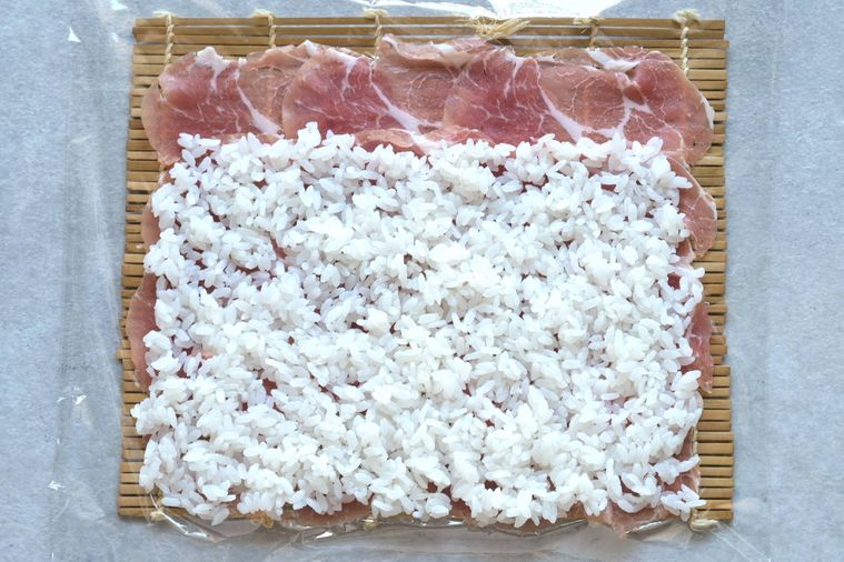 生ハムの上に酢飯をのせ、奥を2~3cmほどを空けて薄く広げます。
