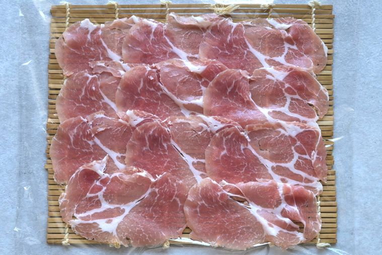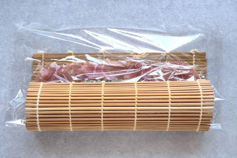 巻きすの上にラップをしき、生ハムを少し重ねてずらしながら並べます。