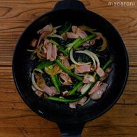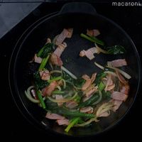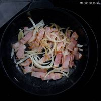 フライパンにサラダ油を熱し、ベーコン、玉ねぎを入れて炒めます。