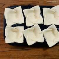 マフィン型を冷蔵庫から出し、具材を均等に入れます。