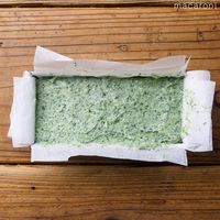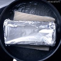 パウンド型に、ピンク・白・緑の順に生地を入れてゴムベラでならし、アルミホイルでフタをします。
