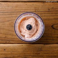 [B]の卵白、塩を加えて攪拌したら、生クリームを加えて混ぜてピンクの生地にします。