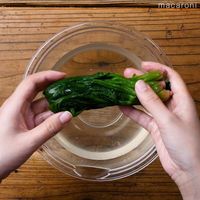 ほうれん草を1分ほどゆで、水にさらしてからしっかり絞ります。