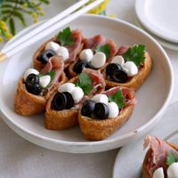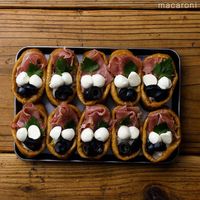 生ハム、モッツァレラチーズ、オリーブを乗せ、イタリアンパセリをトッピングしたら完成です。
