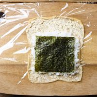 巻き簀に軽く汁気を絞った油揚げをのせ、酢めしを手前と奥に少し隙間を空けて広げ、のりをのせます。