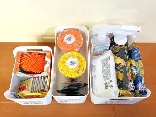 筆者はSサイズにティーバッグ、Mサイズにレトルトスープ、Lサイズに掃除道具を入れてみました。キッチンの引き出しにそのまま入れることができ、上から見やすく取り出しやすいのが便利!