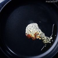フライパンにオリーブオイル、にんにく、唐辛子を入れて弱火にかけます。