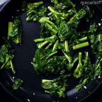 香りが立ったら、菜の花を加えて鮮やかになるまで炒めます。