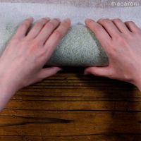 巻き終わりにめん棒をあて、クッキングシートの端を引っ張って形を整えます。