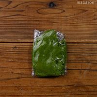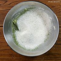 薄力粉、アーモンドプードル、抹茶をふるい入れ、ゴムベラで切り混ぜます。